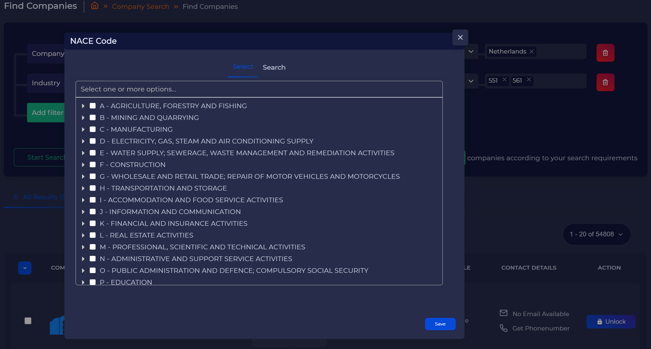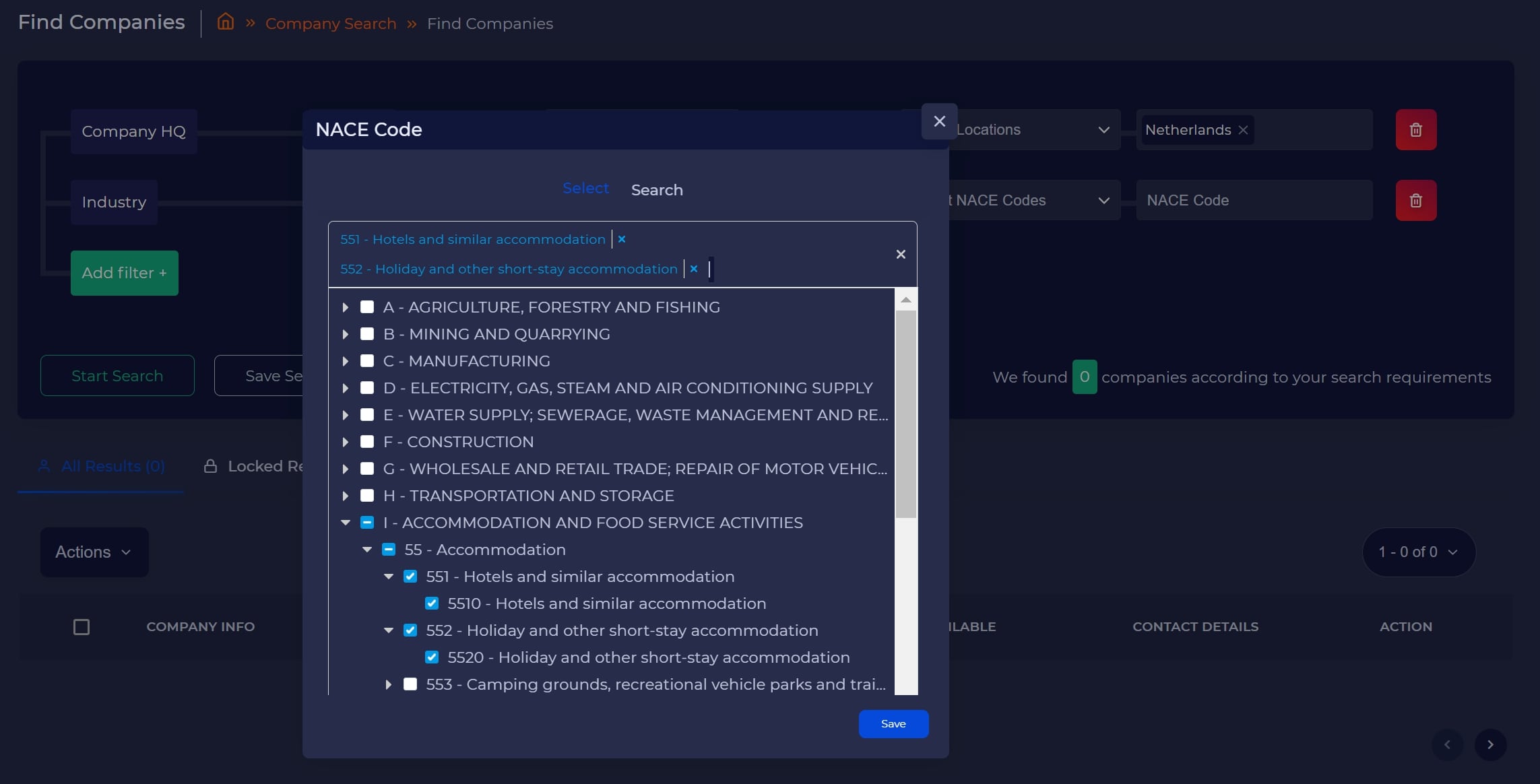 In the Industry filter, add the "NACE Code" subfilter to your search parameters and click on " Select NACE codes ". Next, to select only the Accommodation industry or a subsection from it, click on the arrow next to I - Accommodation and Food Service Activities and the arrow next to 55 - Accommodation. Like this, you'll be able to check what's within each industry and their subsections, such as the example above which contains: 551 - Hotels and similar accommodation and 552 - Hotels and other short-stay similar accommodation .